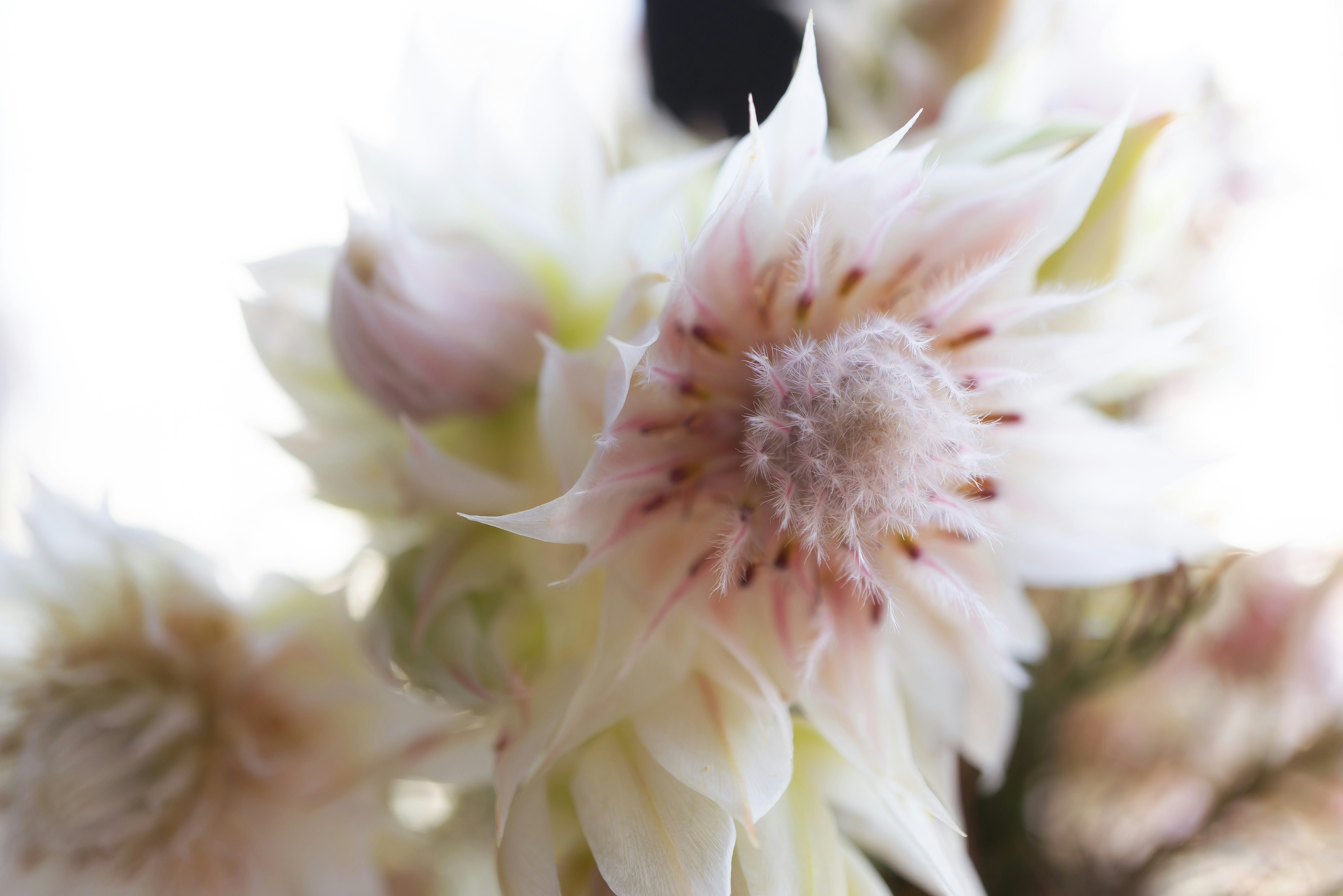 - An up-close look at a Blushing Bride Protea flower, native to South Africa.